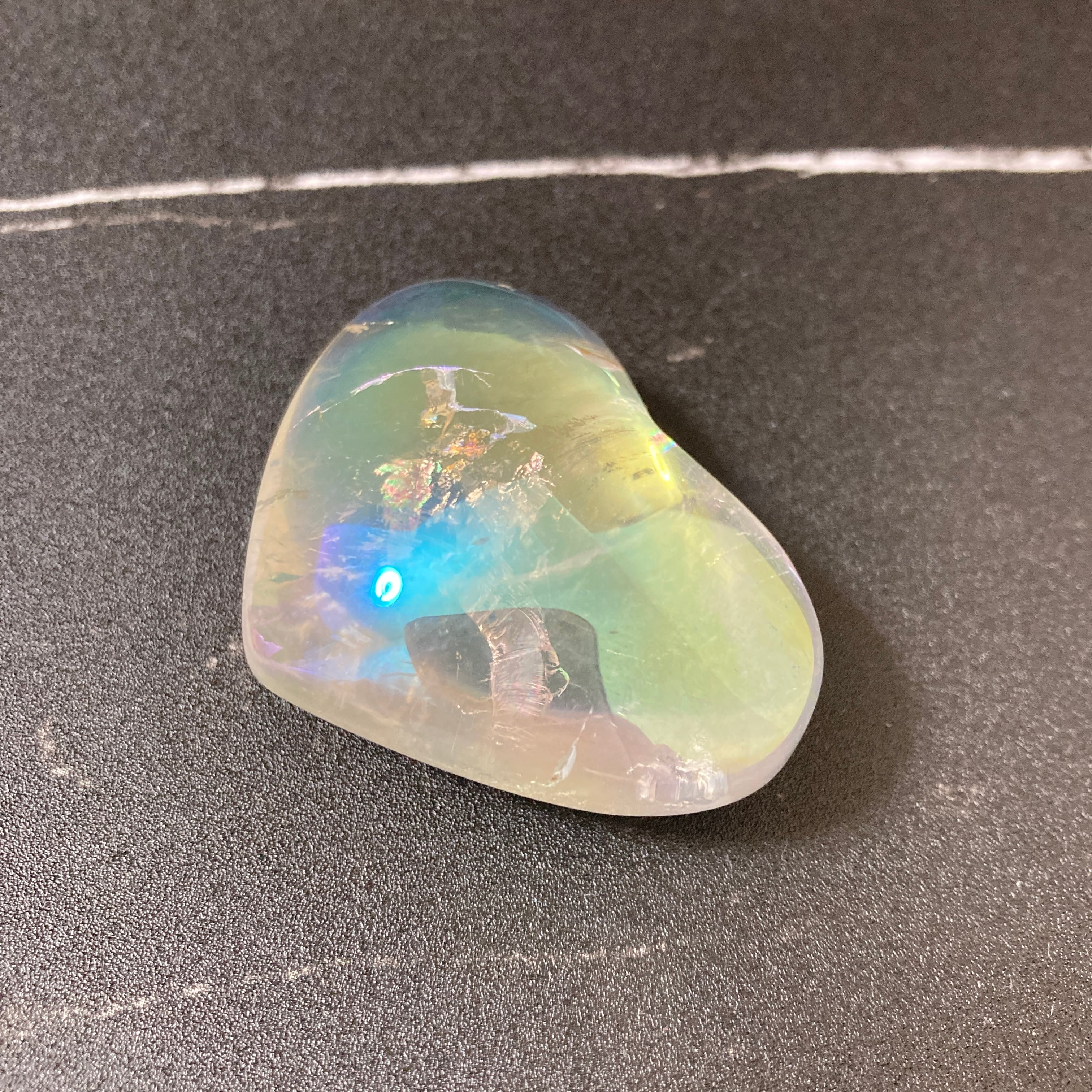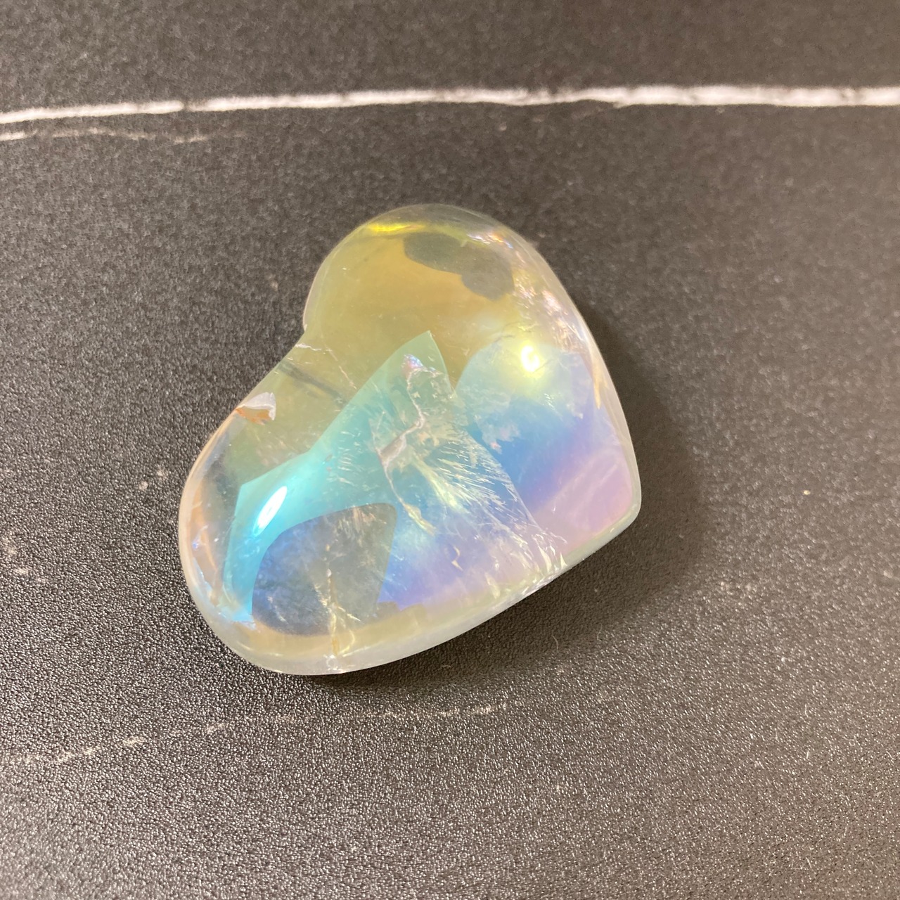 透明感のある水晶にエンジェルオーラ加工を施したハート型のパームストーンです。一部、キズのようなあたりがありますが、天然の水晶のクラックです。